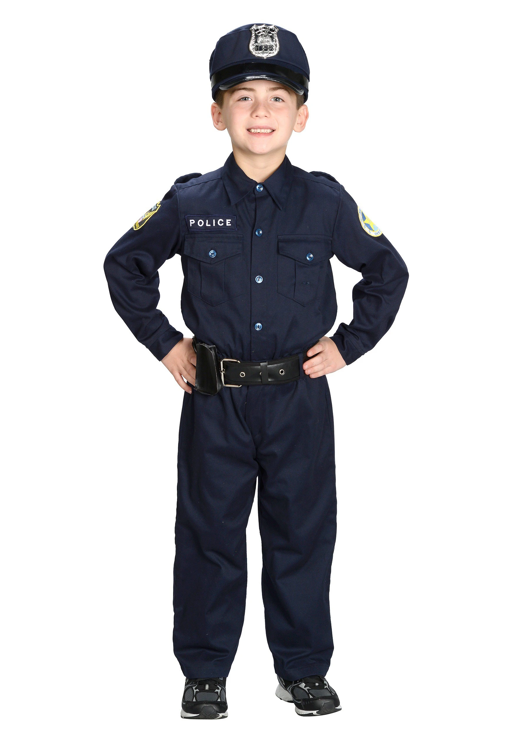 This costume will transform your child into a police officer in the FUN division, working at outpost (insert your house number.) Their uniform will consist of a jumpsuit, a hat, and a belt. The jumpsuit is navy blue and is styled to look like a police officer’s uniform. It says “Police” on the front and has a patch on the sleeve. The hat is adjustable and has a badge on the front. The belt is faux leather and has detailing to make it look like a real police belt! This uniform is standard issue for officers in the FUN division and should suit them well.Â